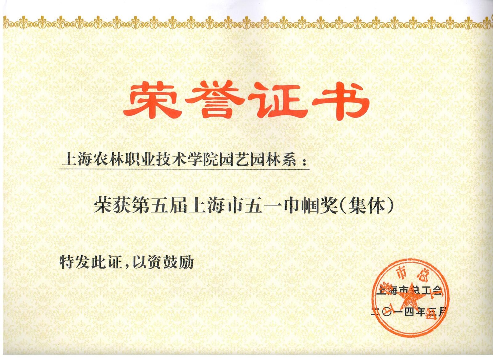 为贯彻落实党的十八届三中全会和市第十次党代会精神,大力弘扬劳模精神,进一步倡导辛勤劳动、诚实劳动、创造性劳动,宣传展示广大女职工在上海创新驱动、转型发展中做出的突出贡献,激励广大女职工积极投身“建功十二五,巾帼绘蓝图”主题活动,上海市总工会于2013年11月开展了第五届上海市五一巾帼奖评选工作。近日,根据上海市总工会《沪工总女[2014]36号》文件精神,我院园艺园林系被授“上海市五一巾帼奖(集体)”称号。