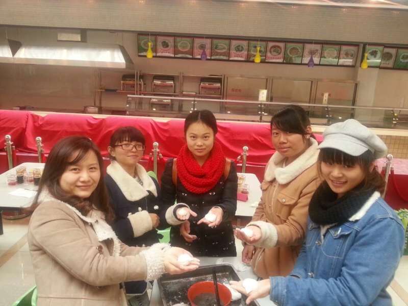来自五湖四海的师生,分成几个组,很多心灵手巧的老师主动担当起教的任务,后勤的阿姨们也前来帮忙,大家有说有笑,热火朝天的和面包汤圆。