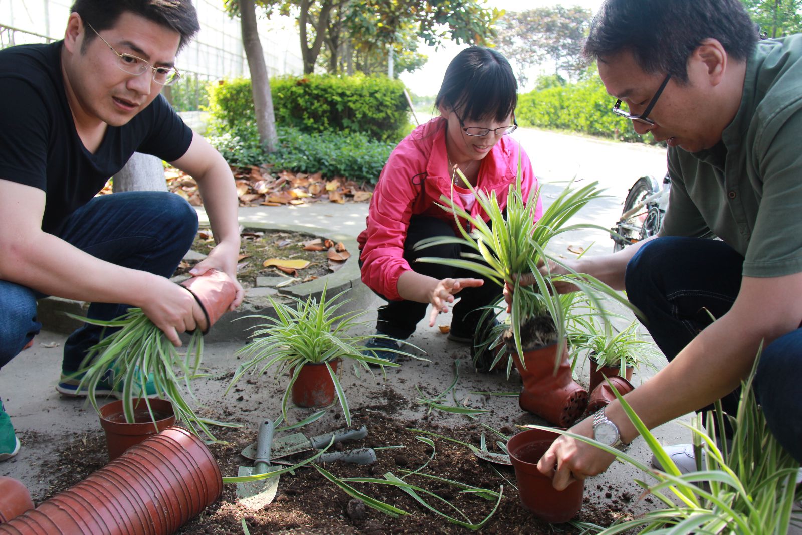 下午14:00,参赛小组成员整装待发,随着裁判的哨声响起,比赛正式开始。一路上,你追我赶,齐心协力,到达第一任务点,每人各选滚铁环、踢毽子、跳绳其中一项任务,任务完成后继续往前骑行,随后到达第二任务点,合力完成吊兰的翻盆工作,完成后继续骑车前进到达终点。比赛过程中,由于教职工的体力各不相同,大家互相鼓励,加油打气。为了取得比赛最好成绩,有的老师包揽了全部的翻盆工作。在美丽的实训基地上,阳光、绿荫下,阵阵田间的清新气息中,经过各小组通力合作的完美配合后,比赛在一片欢声笑语中结束。
