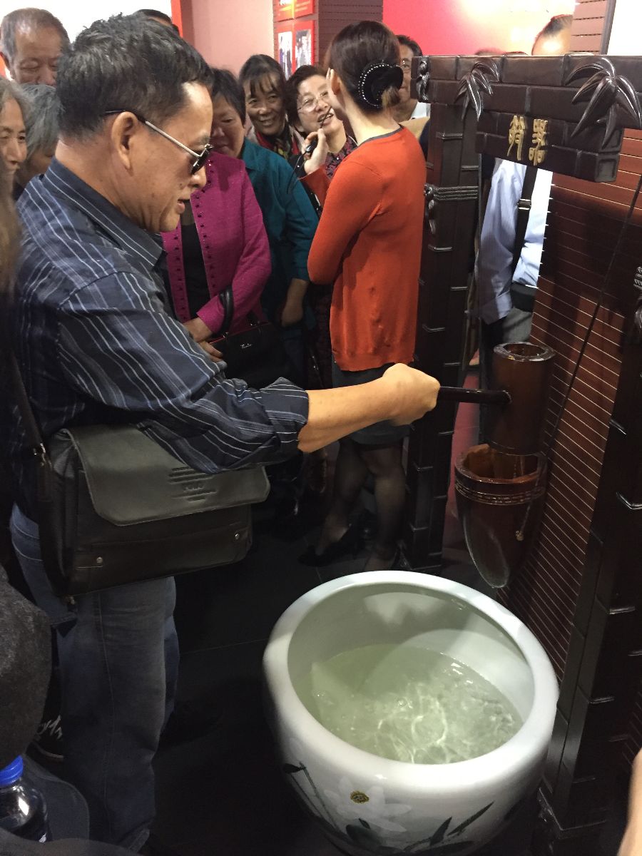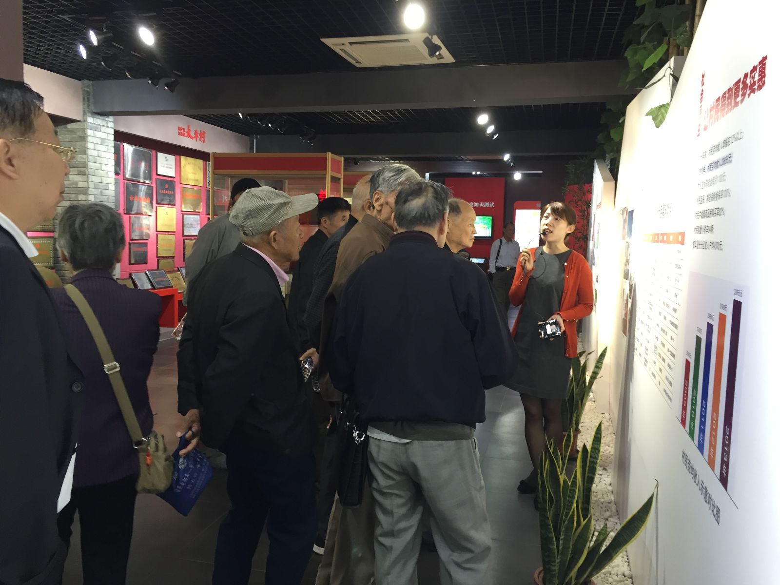 江桥镇太平村的工作人员带领退休教职工介绍参观了村史馆,钟纪国老师亲自体验了村史馆中的欹器,欹器只能注入三勺水,告诫人们满招损,谦受益,地位越高态度要越谦和,官位越高更要关注民生。