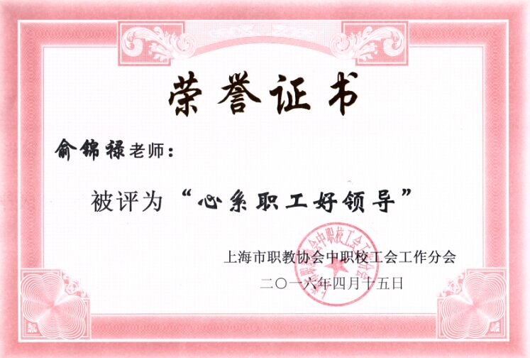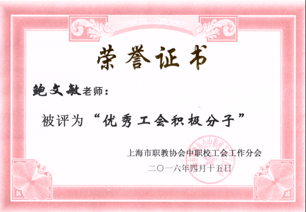 2016年4月15日下午两点,在上海市中职校工会工作分会第二十九届年会上,我院工会组织的“品道德之经典,耕三农之文明”主题活动获得了“优秀案例奖”,俞锦禄同志被评为“心系职工好领导”称号,张媛同志被评为“先进工会干部”称号,鲍文敏被评为“优秀工会积极分子”称号。