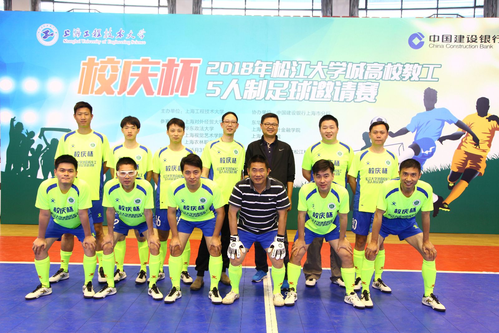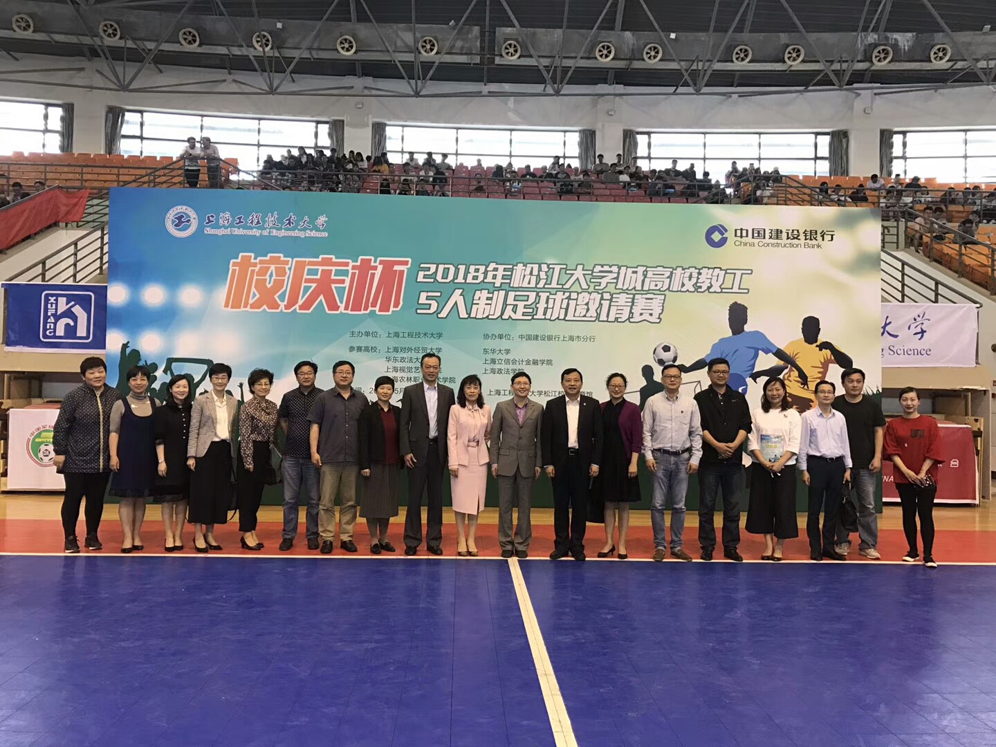 “校庆杯”2018年松江大学城高校教工5人制足球邀请赛于5月3日在上海工程技术大学松江校区开幕,共有松江大学城的八所高校参加。工会主席高功辉率领我院代表队一行14人出席了开幕式。我院代表队由教工足球社团中的13名教职工组成。