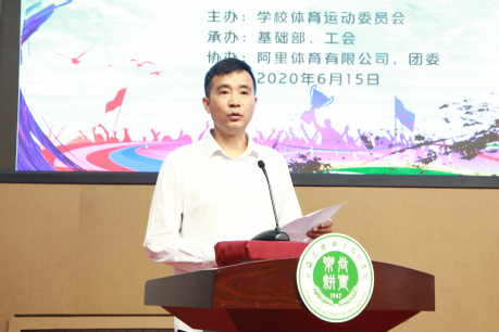 升旗仪式开始,全体教职工代表面向国旗,奏唱中华人民共和国国歌。学校体育运动委员会主任费国强致开幕词,出席开幕式的领导一起启动“云”动会正式开幕。