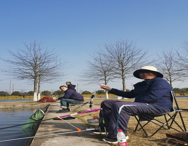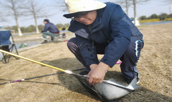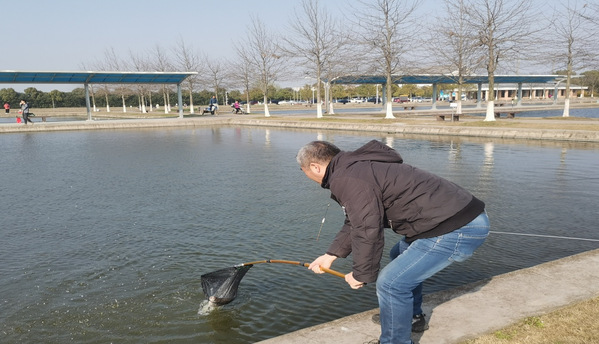 活动当天,阳光明媚,老师们兴致勃勃,大家散坐在池溏边,调鱼食,上鱼饵,抛鱼线,忙得不亦乐乎。随着鱼杆的舞动,欢呼声此起彼伏,在初春的暖阳里,别有一番乐趣。