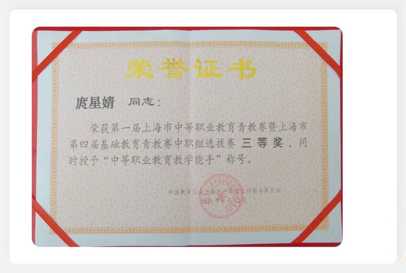 3月22日,中国教育工会上海市中职校联合工作委员会公示了第一届上海市中等职业教育青教赛暨上海市第四届基础教育青教赛中职组选拔赛评审结果,我校庹星婧老师荣获三等奖。