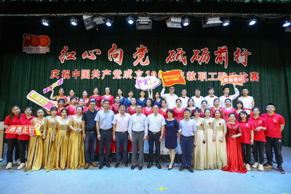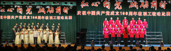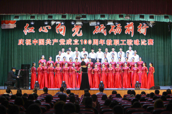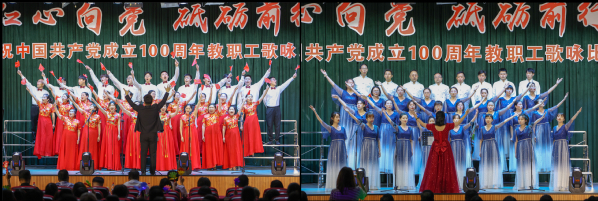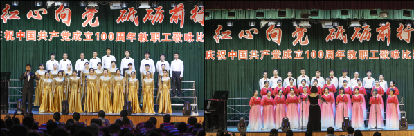 晚上6点,比赛在全场热烈的掌声中拉开帷幕。由学校8个党总支选派的8支师生合唱队带来了《中国中国,鲜红的太阳永不落》《我爱你,中国》《不忘初心》《走向复兴》《没有共产党就没有新中国》《歌唱祖国》等16首激情洋溢的经典红色歌曲。由老师和同学组成的8支合唱队都满怀豪情、慷慨激昂,用歌声表达了对党和祖国的无限热爱,用歌声点燃了现场每位师生心中喜迎建党100周年火热激情。